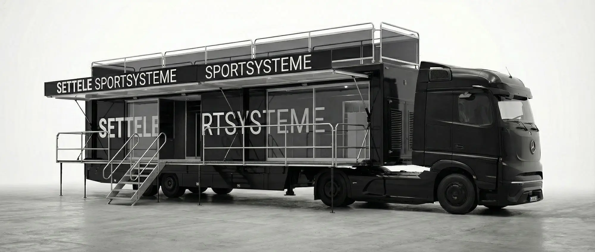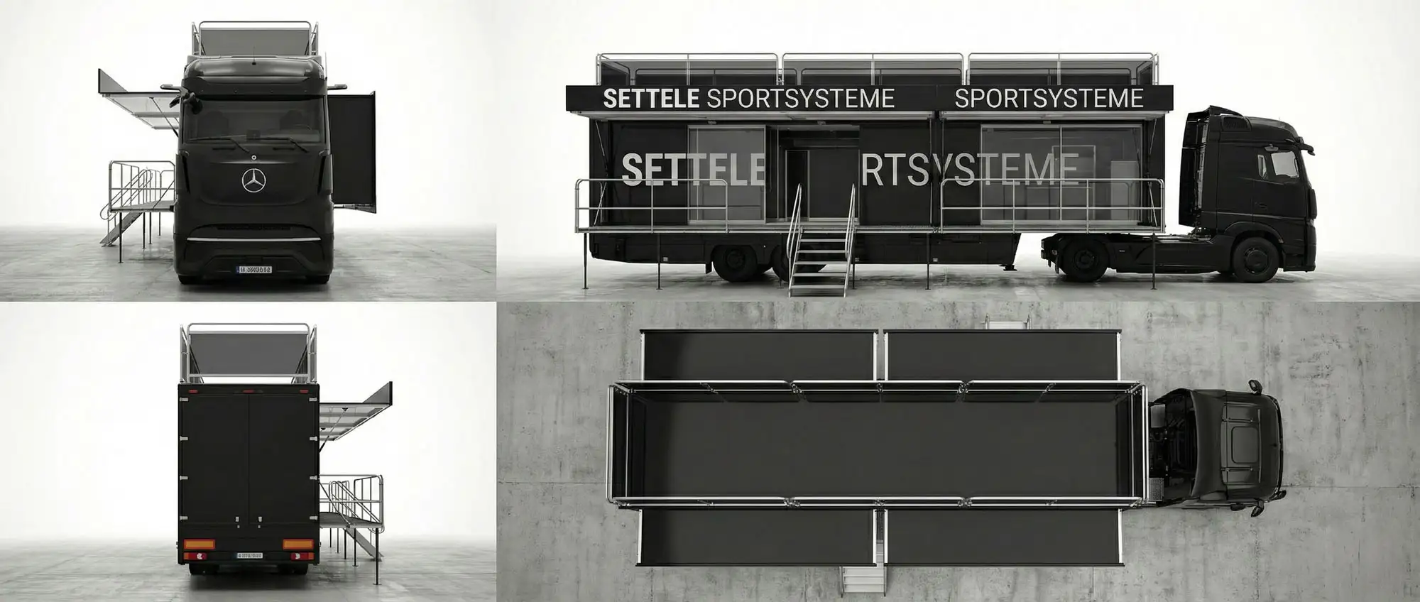 Der Settele Event Truck ist eine vollausgestattete mobile Kommandozentrale für professionelle Sportveranstaltungen auf Basis eines Mercedes-Benz Actros mit hydraulischem Seitenausschub. Im ausgeklappten Zustand bietet der Truck über 45 Quadratmeter Nutzfläche auf zwei voll klimatisierten Etagen und insgesamt 12 bis 16 vollausgestattete Arbeitsplätze mit modernster Technik. Die untere Etage dient als zentraler Arbeitsbereich für die Rennleitung, die Zeitmess-Zentrale und die TV-Regie mit mehreren Monitoren und professionellen Kommunikationssystemen. Die obere Etage mit einer begehbaren Dachterrasse bietet Platz für VIP-Empfänge, Sponsoren-Hospitality und Medieninterviews mit direktem Blick auf das Wettkampfgeschehen. Der Event Truck ist innerhalb von nur zwei Stunden nach Ankunft am Veranstaltungsort vollständig einsatzbereit und komplett autark betreibbar: Eigenes Stromaggregat, Satelliten-Internet mit LTE-Backup, leistungsstarke Klimaanlage, Sanitäranlagen und eine vollausgestattete Küche ermöglichen den professionellen Betrieb auch an abgelegenen Veranstaltungsorten ohne jede vorhandene Infrastruktur. Der Truck wird europaweit bei FIS-Weltcup-Serien, internationalen Meisterschaften und Olympischen Spielen eingesetzt.